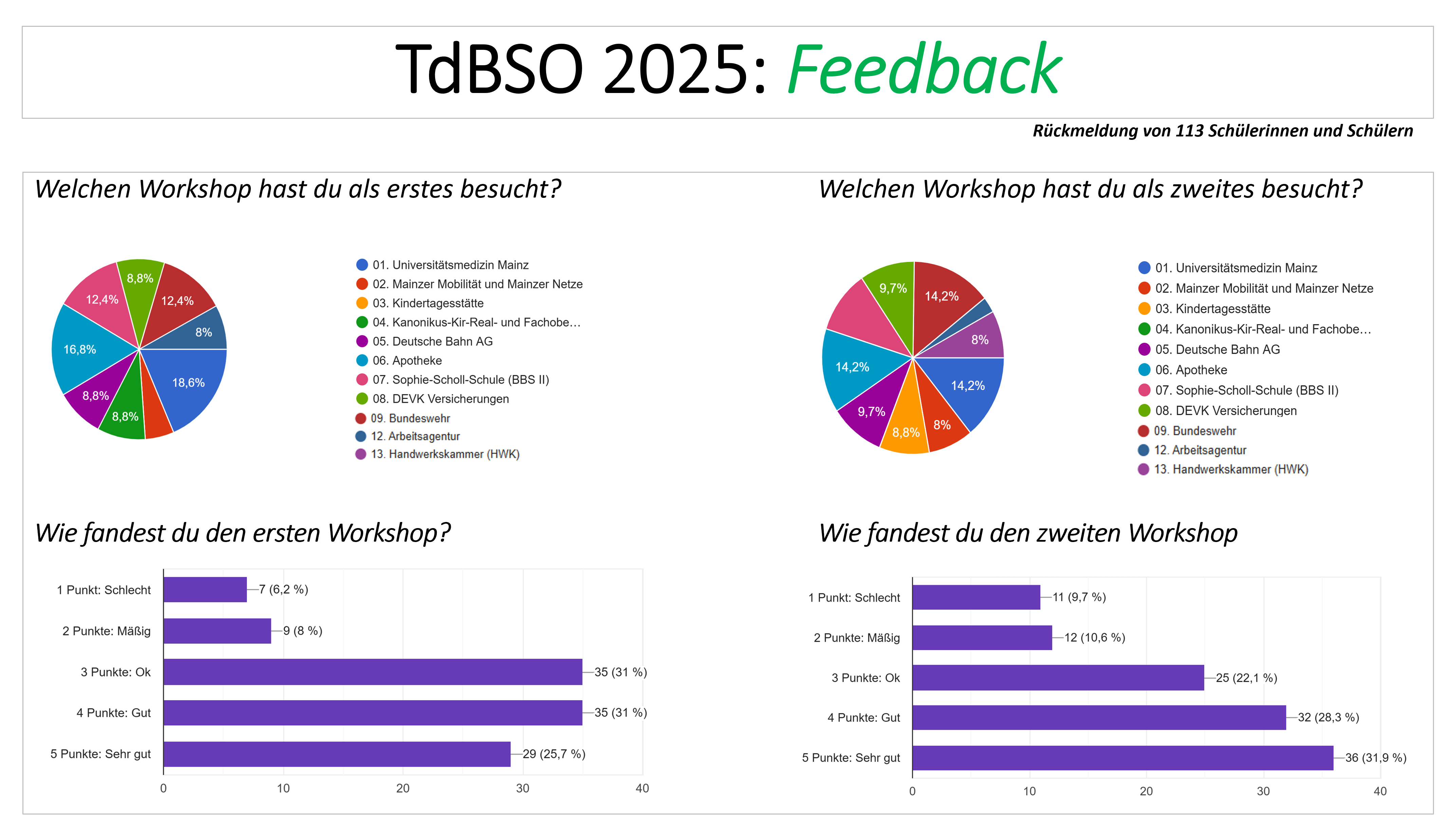 Im Anschluss haben wir eine kurze Abfrage zu den Ergebnissen des Tags der Berufs- und Studienorientierung erstellt, die unsere positive Einschätzung aus dem Tag deutlich bestätigt hat. Über 80 Prozent der Schüler haben beide Veranstaltungen positiv bewertet.