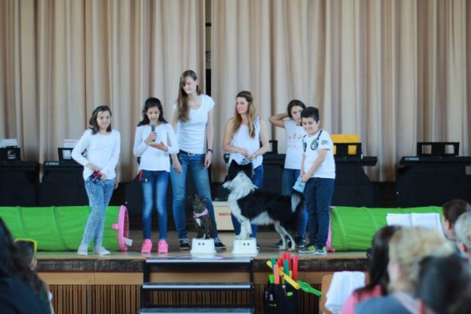 In der AG lernen die Schülerinnen und Schüler wie man uns Tricks beibringen kann. Zudem erklären unsere Frauchen den Kids unsere „Sprache“. Wir lernen besonders gut über die menschliche Körpersprache. Dabei spielen Handzeichen und auch die Körperhaltung der Menschen eine besondere Rolle. Mit dem passenden Wortsignal verstehen wir, was von uns verlangt wird.